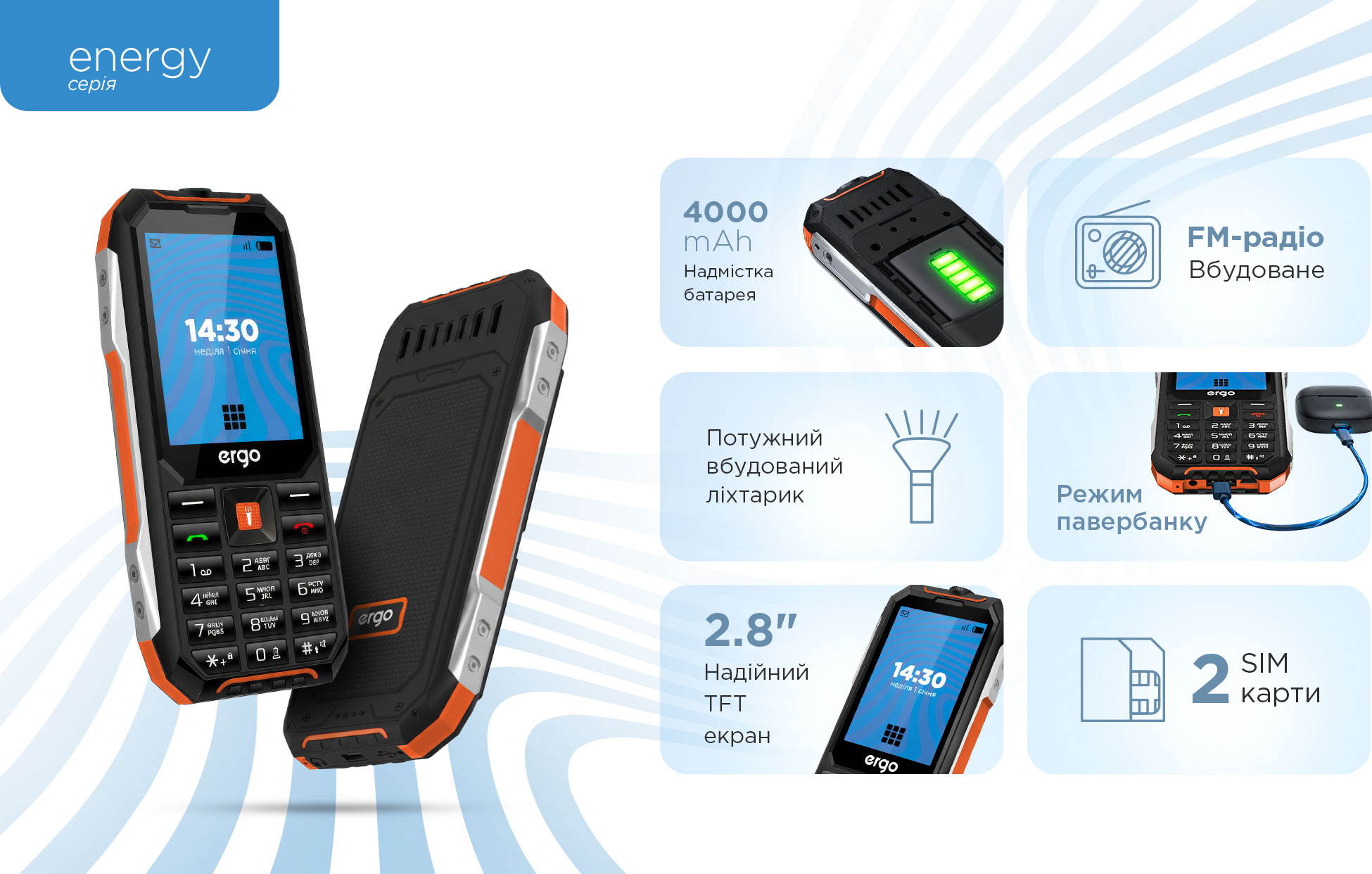 Телефон ERGO E283 може не лише споживати, але й віддавати енергію, виконуючи функцію аварійного зарядного пристрою для інших гаджетів.
