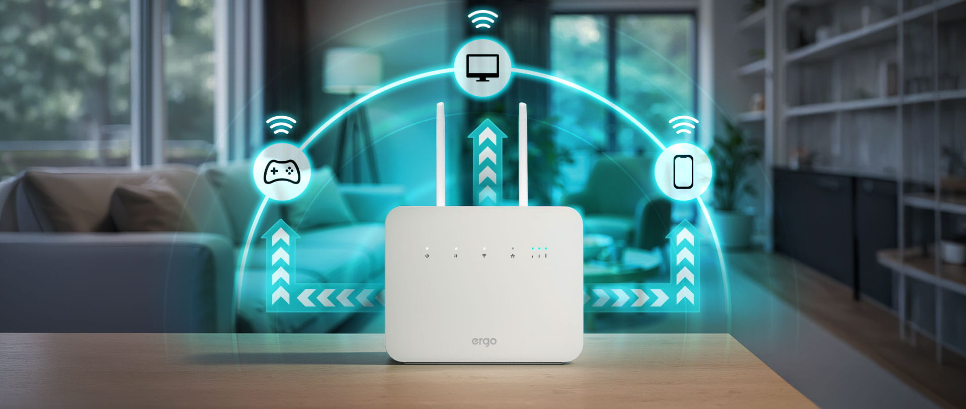 Крім високої швидкості обміну даними з 4G-мережами, роутер ERGO R291 також надзвичайно швидко працює і у внутрішніх мережах. Робота Wi-Fi відбувається на частотах 2.4 ГГц та 5 ГГц із сумарною швидкістю до 1200 Мбіт/с, що дозволяє виконувати як прості завдання з надсилання пошти, перегляду сторінок, так і завдання, що вимагають великої пропускної здатності: онлайн-ігри або потокове відео.