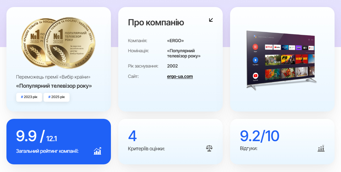 Бренд ERGO став переможцем в номінації «Популярний телевізор 2025 року» національного рейтингу «Вибір країни». Це вже друга нагорода для бренду, адже телевізори ERGO вже визнавались найкращими за результатами досліджень 2023 року.