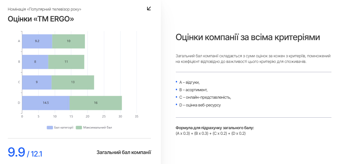 Цьогоріч бренд ERGO так само успішно пройшов тривале та ретельне дослідження за понад 20 критеріями, серед яких були рівень популярності, співвідношення ціни та якості, інноваційність, довіра споживачів тощо. У підсумку експерти відзначили, що саме телевізори ERGO максимально відповідають очікуванням українського покупця, пропонуючи якісний технологічний продукт у доступному ціновому сегменті.